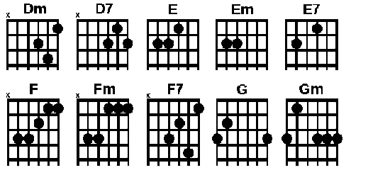 Description: Reference diagrams showing fingerings for all common open chords on the guitar.
